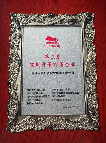 在本次盛典上,百泰集团获评2019年度“深圳质量百强企业”,这是继“2016深圳企业100强”、“2017中国轻工业百强企业”及“2018深圳品牌百强企业”等众多荣誉之后,再次斩获的一大殊荣。